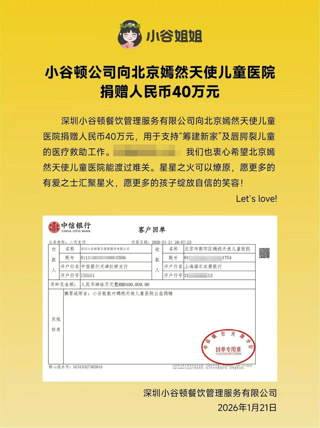 北京嫣然天神儿童病院始终以来勉力于唇腭裂儿童的专项救治,近期因运营压力受到社会各界的关注。近日,曾因“为求职者披发66元口试补贴红包”,被求职者称为“至人公司”而备受网友赞扬的深圳小谷顿公司,1月21日缄默伸出援手,向面对运营压力的北京嫣然天神儿童病院捐赠40万元。